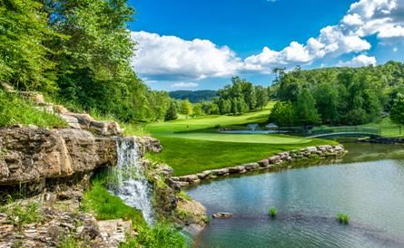 Branson Hills Golf Club is a tribute course honoring Legendary Missouri Golfers. Natural rock outcroppings, waterfalls, creeks and wooded areas are incorporated into its design features. Yardages vary from 7,324 to 5,323, offering five distinct teeing areas providing a challenge to all calibers of golfers. The course was designed by Chuck Smith with design consultant and PGA Professional, Bobby Clampett.